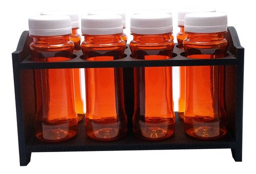 O Kit é composto por 1 Porta Temperos em Madeira MDF, 8 Frascos Laranjado Vazios 120ml e 8 Tampas Pretas Rosca Lacre.