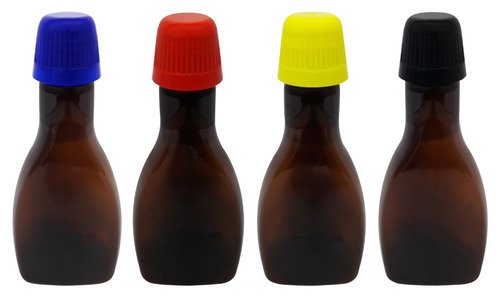 O Kit é composto por 116 Frascos Âmbares Vazios e 116 Tampas Brancas Dosadoras com Rosca