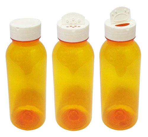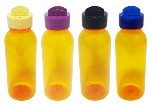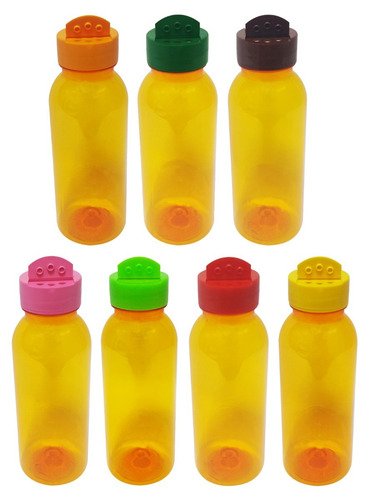 O Kit é composto por 163 Frascos Laranjados Vazios e 163 Tampas Brancas Rosca Flip Top