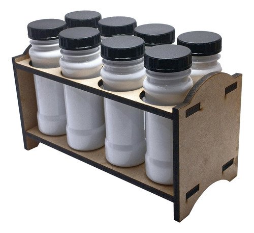O Kit é composto por 2 Portas Temperos em Madeira MDF, 16 Frascos Branco Vazios 120ml e 16 Tampas Pretas Rosca Sem Lacre.
