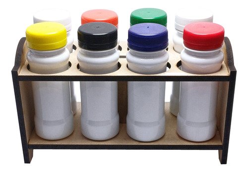 O Kit é composto por 2 Portas Temperos em Madeira MDF, 16 Frascos Brancos Vazios 120ml e 16 Tampas Pretas Rosca Lacre.