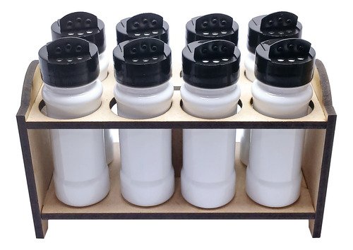 O Kit é composto por 2 Portas Temperos em Madeira MDF, 16 Frascos Brancos Vazios 120ml e 16 Tampas Pretas Rosca Flip Top.