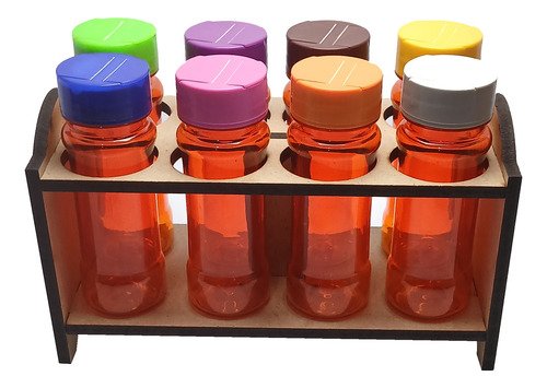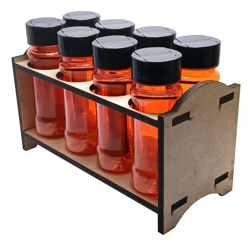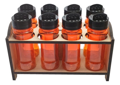 O Kit é composto por 2 Portas Temperos em Madeira MDF, 16 Frascos Laranjado Vazios 120ml e 16 Tampas Brancas Rosca Flip Top.