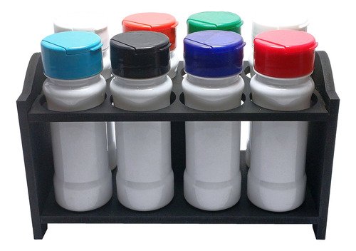 O Kit é composto por 2 Portas Temperos em Madeira MDF, 16 Frascos Brancos Vazios 120ml e 8 Tampas Pretas Rosca Flip Top.