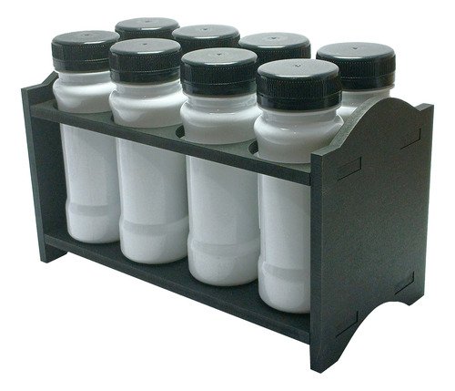 O Kit é composto por 2 Portas Temperos em Madeira MDF, 16 Frascos Brancos Vazios 120ml e 16 Tampas Pretas Rosca Lacre.