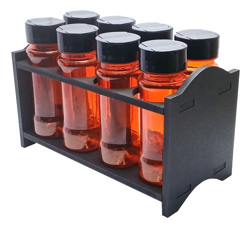 O Kit é composto por 2 Portas Temperos em Madeira MDF, 16 Frascos Laranjado Vazios 120ml e 16 Tampas Brancas Rosca Flip Top.