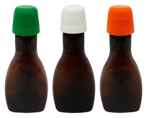 O Kit é composto por 26 Frascos Âmbares Vazios e 26 Tampas Brancas Dosadoras com Rosca