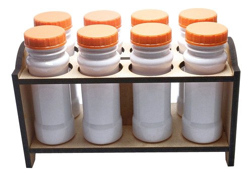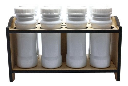 O Kit é composto por 3 Portas Temperos em Madeira MDF, 24 Frascos Branco Vazios 120ml e 24 Tampas Pretas Rosca Sem Lacre.