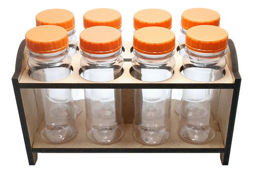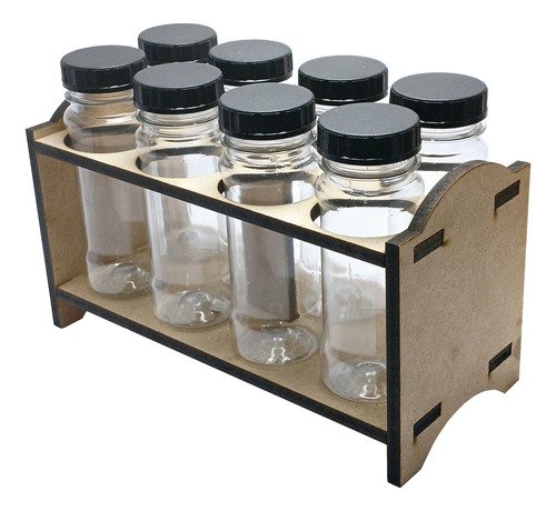 O Kit é composto por 3 Portas Temperos em Madeira MDF, 24 Frascos Cristal Vazios 120ml e 24 Tampas Pretas Rosca Sem Lacre.
