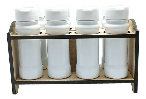 O Kit é composto por 3 Portas Temperos em Madeira MDF, 24 Frascos Brancos Vazios 120ml e 24 Tampas Pretas Rosca Flip Top.