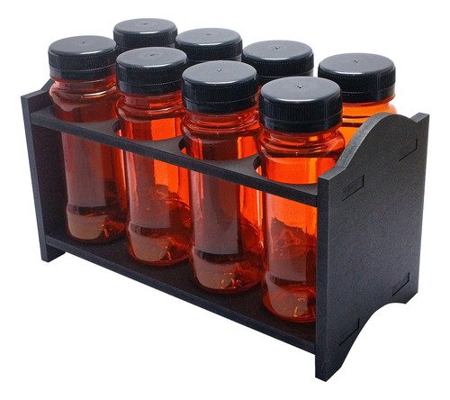 O Kit é composto por 3 Portas Temperos em Madeira MDF, 24 Frascos Laranjado Vazios 120ml e 24 Tampas Pretas Rosca Lacre.