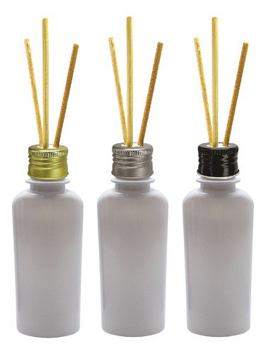 O Kit é composto por 336 Frascos Branco Vazios, 336 Tampas Alumínio Com Rosca Com Furo e 1008 Varetas de Bambu.