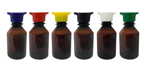 O Kit é composto por 40 Frascos Âmbares Vazios e 40 Tampas Brancas com Rosca sem Lacre 2 Bicos