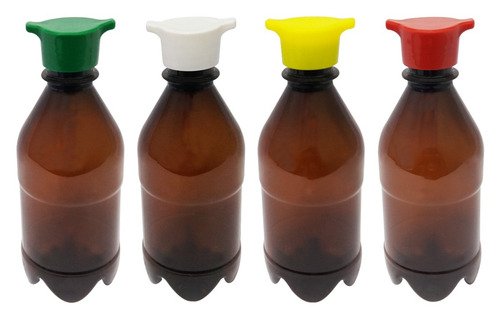 O Kit é composto por 70 Frascos Âmbares Vazios e 70 Tampas Brancas com Rosca sem Lacre 2 Bicos