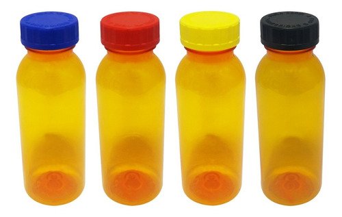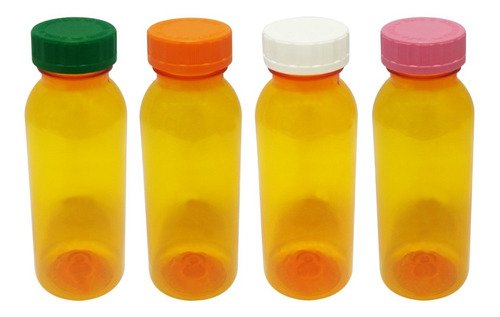 O Kit é composto por 70 Frascos Laranjados Vazios e 70 Tampas Brancas Child 2 Roscas c/ Escrita