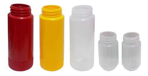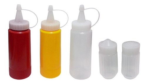 O Kit é composto por 3 Bisnagas Incolor, 2 Saleiros e 1 Paliteiro. Todos com Tampas Rosca sem Lacre